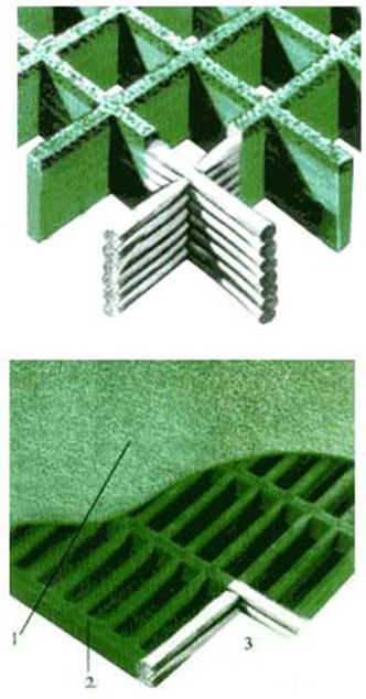 Continuous fiberglass roving is placed in the open, heated mold in alternating layers, wetted out thoroughly with resin. Such a process produce an integral, one- piece construction, which offers excellent corrosion resistance and bi-directional strength as well. The mould is heated to cure the panel after such a fiberglass-roving- weaving process. If embedded grit top surface is required for extra anti-slip, the mould will receive grit at this time before the panel is cured. Upon curing, the panel is ejected from the mould, and at this time, the panel will typically have a concave(meniscus) top surface for slip resistance. Should a standard applied-grit top surface is needed, a secondary operation follows, that is: the grit will be bonded to the top of the completed panel.